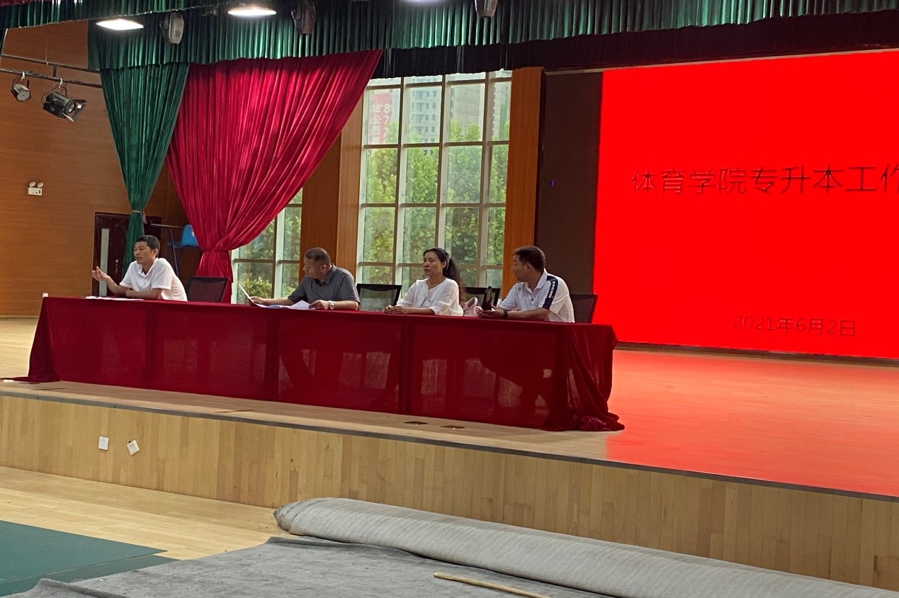 2021年6月2日,我校2021届专升本学生回到熟悉的校园。为迎接专升本返校生,做好专升本学生的安全教育和诚信考试工作。体育学院院长、体育学院副院长王朝霞、体育学院学管办主任李海磊、体育场学院办公室主任袁鹏科出席了本次会议。