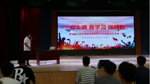 9月16日下午,体育学院党总支副书记王晖以“立大德,善学习,强特色”为题,为体育学院2022级新生上了生动一课。